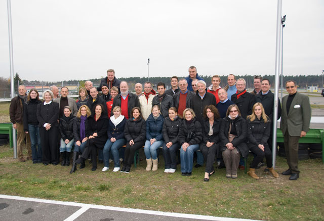 Das Foto zeigt die Teilnehmer des Pkw-Kompakt-Trainings für Rotarier auf dem Gelände des ADAC Fahrsicherheitszentrum Hockenheimring.