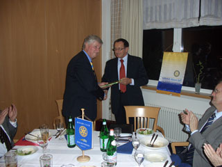 Danach ergriff der Governor das Wort und stellte sich kurz vor. Er berichtete von seinem Besuch der diesjährigen Rotary-Convention in Chicago und machte einen Rückblick auf 100 Jahre Rotary. Weiterhin berichtete der Governor von den Jahreszielen des Weltpräsidenten Carl-Wilhelm Stenhammer und und dessen neues und altes Motto „Service Above Self“, selbstloses Dienen. Der Governor stellte auch klar, dass das Beste was Rotary hat, seine Mitglieder, seine Clubs sind. Er verwies auf die Aktivitäten unseres Clubs, bei denen wir beweisen, dass wir den Blick für die Gemeinschaft haben, soziale Brennpunkte erkennen und entsprechend handeln, ebenso wie Rotary Clubs in 167 Ländern dieser Welt. Keine Organisation auf der ganzen Welt agiert so zielgerichtet, so effizient, so kostengünstig.