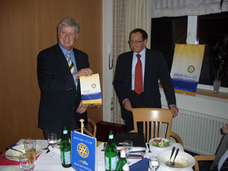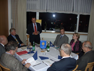 Danach ergriff der Governor das Wort und stellte sich kurz vor. Er berichtete von seinem Besuch der diesjährigen Rotary-Convention in Chicago und machte einen Rückblick auf 100 Jahre Rotary. Weiterhin berichtete der Governor von den Jahreszielen des Weltpräsidenten Carl-Wilhelm Stenhammer und und dessen neues und altes Motto „Service Above Self“, selbstloses Dienen. Der Governor stellte auch klar, dass das Beste was Rotary hat, seine Mitglieder, seine Clubs sind. Er verwies auf die Aktivitäten unseres Clubs, bei denen wir beweisen, dass wir den Blick für die Gemeinschaft haben, soziale Brennpunkte erkennen und entsprechend handeln, ebenso wie Rotary Clubs in 167 Ländern dieser Welt. Keine Organisation auf der ganzen Welt agiert so zielgerichtet, so effizient, so kostengünstig.