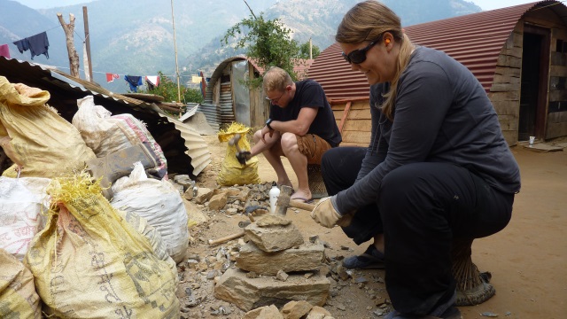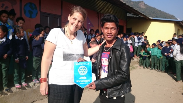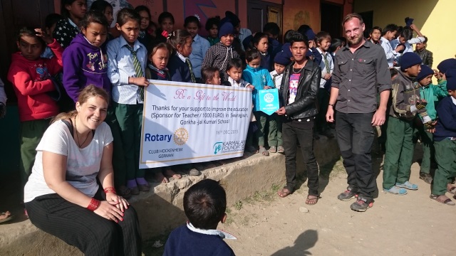 Förderung von Volontärarbeit im Epizentrum Nepals 20165 Wochen Volontärarbeit im Epizentrum nach dem Erdbeben von 2015Bericht von Karin List und Sven NitschWarum immer nur nehmen und nicht auch mal geben? Dieser Leitsatz hat uns im letzten Jahr dazu bewegt unseren Urlaub in einem Workcamp zu verbringen anstatt auf einem Liegestuhl. Das Ziel: die vom Erdbeben im letzten Jahr schwer getroffene Gorkha Region in Nepal. Als Volontäre von Karmalaya - heart work & soul travel wurden wir für diesen Einsatz bestens vorbereitet. Im Bergdorf Swaragau angekommen, das nur über einen vierstündigen, steilen Fußmarsch erreichbar ist, gibt es aufgrund der abgeschiedenen Lage noch immer viel für den Wiederaufbau zu tun. Alles in manueller Arbeit, ohne Strom, ohne Maschinen – dafür sehr idyllisch gelegen mit Blick auf das über 7.000m hohe Bergmassiv Himal Ganesh. Wir durften beim Neubau des erdbebensicheren Hauses für die dort lebenden sehbeeinträchtigten und blinden Kinder unterstützen, Wasserleitungen von der Quelle ins Dorf verlegen, Wände verputzen und Fundamente graben. Der Empfang war sehr herzlich, während unseres Aufenthalts wurden wir in das dortige Leben integriert und jeder einzelne Tag war eine Bereicherung. Besonders dankbar sind wir unserer Familie, den Freunden und dem Rotary Club Hockenheim für die Spenden in Höhe von € 3.200, die vor Ort in den Bau des Blindenheims, warme Mützen für 200 Schulkinder sowie in die Finanzierung eines Dorflehrers geflossen sind. Gerade nach dem Erdbeben ist Nepal auf den Tourismus angewiesen. Wir können es jedem Trekking-Begeisterten empfehlen, dieses wunderbare Land zu bereisen – vielleicht sogar als Volontär.